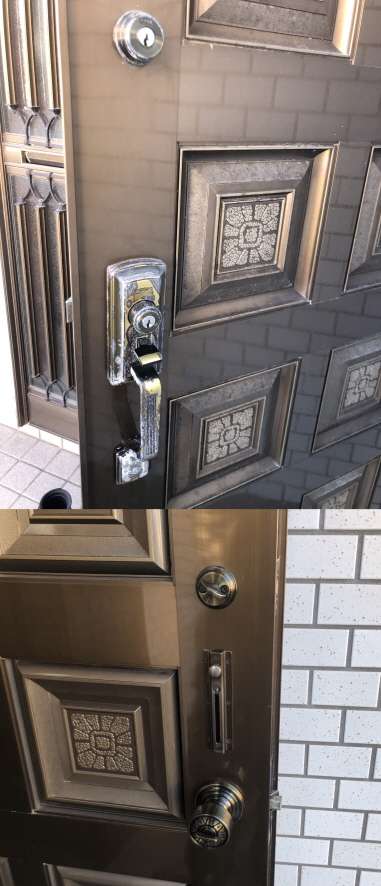 即日で現場へ急行し、玄関ドアの修理・開錠作業を行いました。
